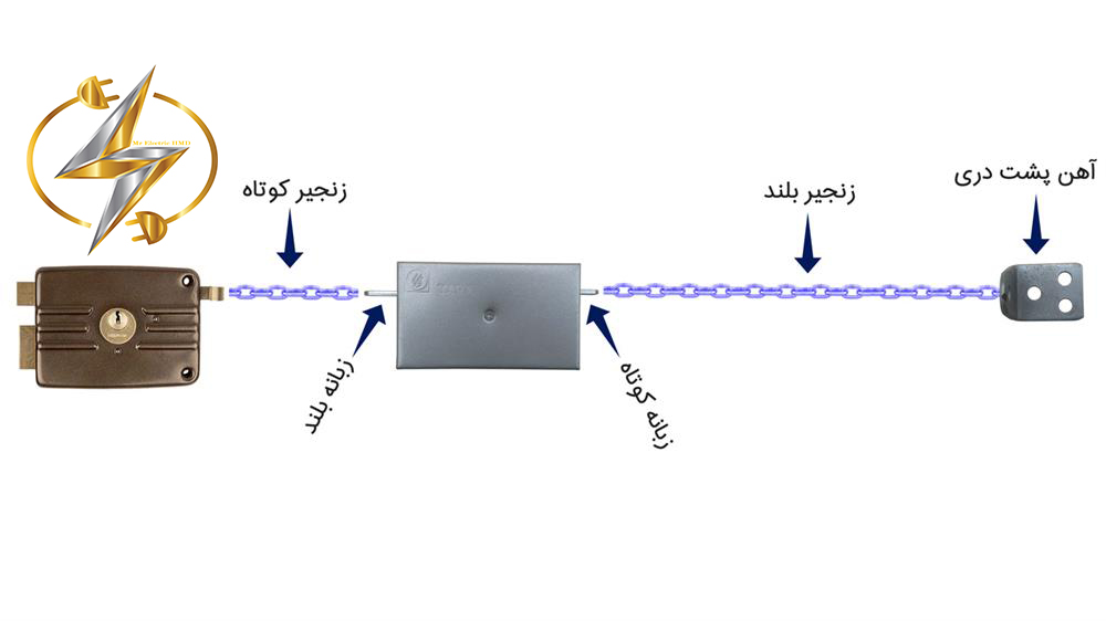 قفل دربازکن زنجیری FF TECHNOLOGY یکی از قدیمی ترین و پرکاربرد ترین محصولات و لوازم جانبی آیفون تصویری بشمار می رود که با نصب آن می تواند بوسیله گوشی آیفون صوتی و یا مانیتور آیفون تصویری درب را برای مراجعه کنندگان باز نمود. شرکت FF TECHNOLOGY به عنوان یکی از بزرگترین تولیدکنندگان جک پارکینگی و دربازکن های تصویری در ایران محسوب می شود که محصولات خود را با گارانتی 3 ساله جهت جلب رضایت مشتریان خود عرضه می نماید. اجزای قفل زنجیری شامل آهن پشت دری یا بدنه اصلی و دو زبانه کوتاه و بزرگ و همچنین دو عدد زنجیر کوتاه و بلند است که نصب قفل بازکن زنجیری به این صورت می باشد که زنجیر بلند به زبانه کوتاه و زنجیر کوتاه به زبانه بلند متصل می شود و قسمتی که زنجیر کوتاه تری دارد به دستگیره قفل حیاطی و طرف دیگر نیز به آهن پشت در متصل می گردد که می توانید آن را در تصویر زیر ببینید.
